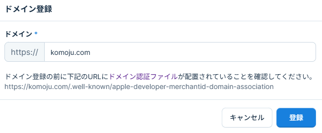 このファイルは HTTP ヘッダーで Content-Type: text/plain を持ち、外部からアクセス可能であり、パスワード保護されておらず、プロキシやリダイレクトを通さない必要があります。正しくホストされている例: https://komoju.com/.well-known/apple-developer-merchantid-domain-association