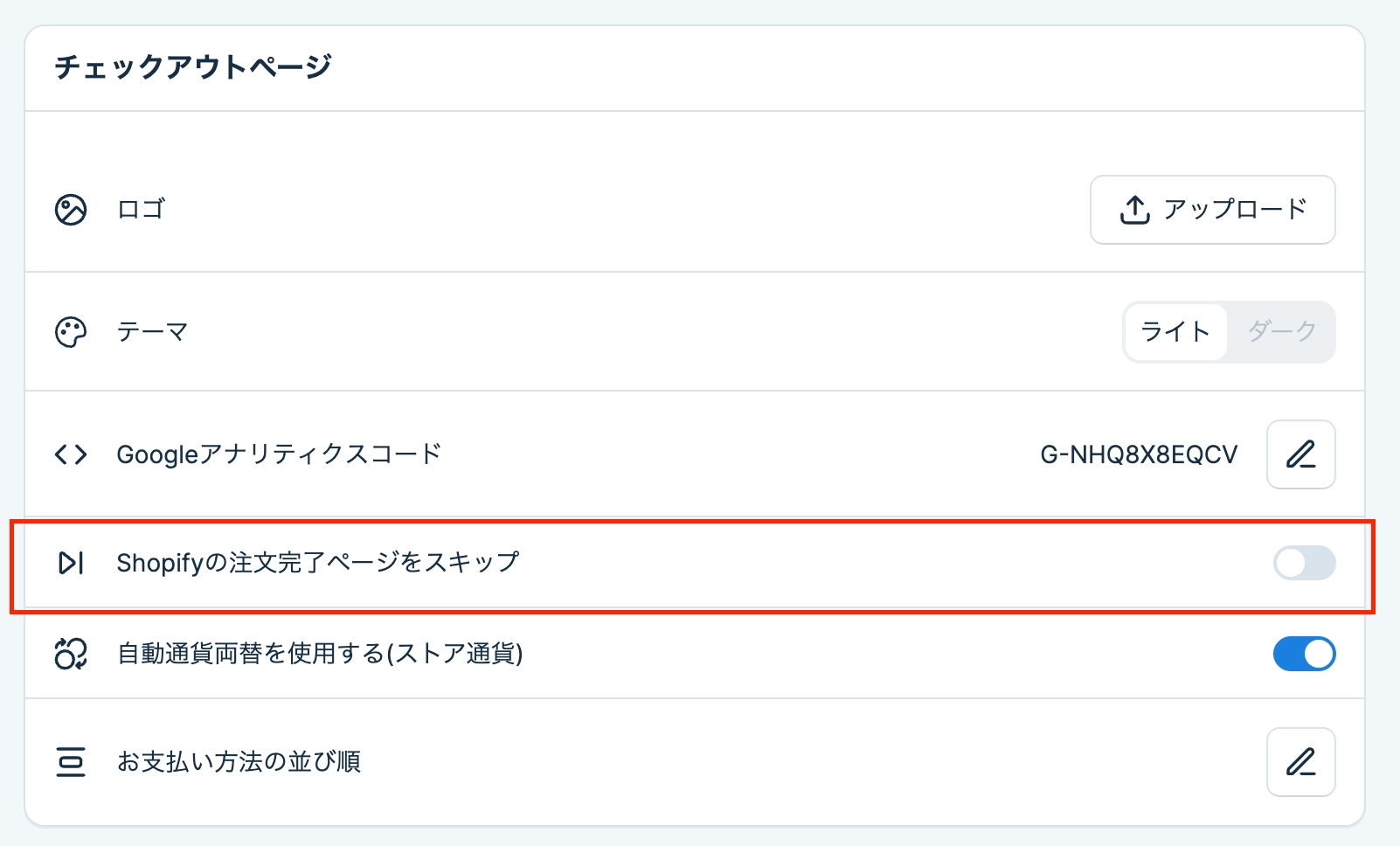 - 「Shopifyの注文完了ページをスキップ」(※実際の項目名)のトグルをオンにすれば完了です。