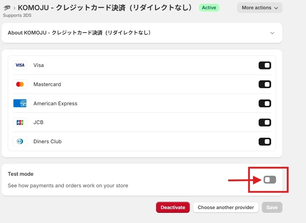 トラブルシューティングや追加のテストが必要な場合は、いつでもテストモードを再度有効にしていただくことが可能です。ただし、テストモードに切り替えた瞬間から、該当の決済方法での実際の決済は受付できなくなります。店舗の営業時間中や、お客さまがお買い物をされている可能性がある時間帯での切り替えにはご留意ください。