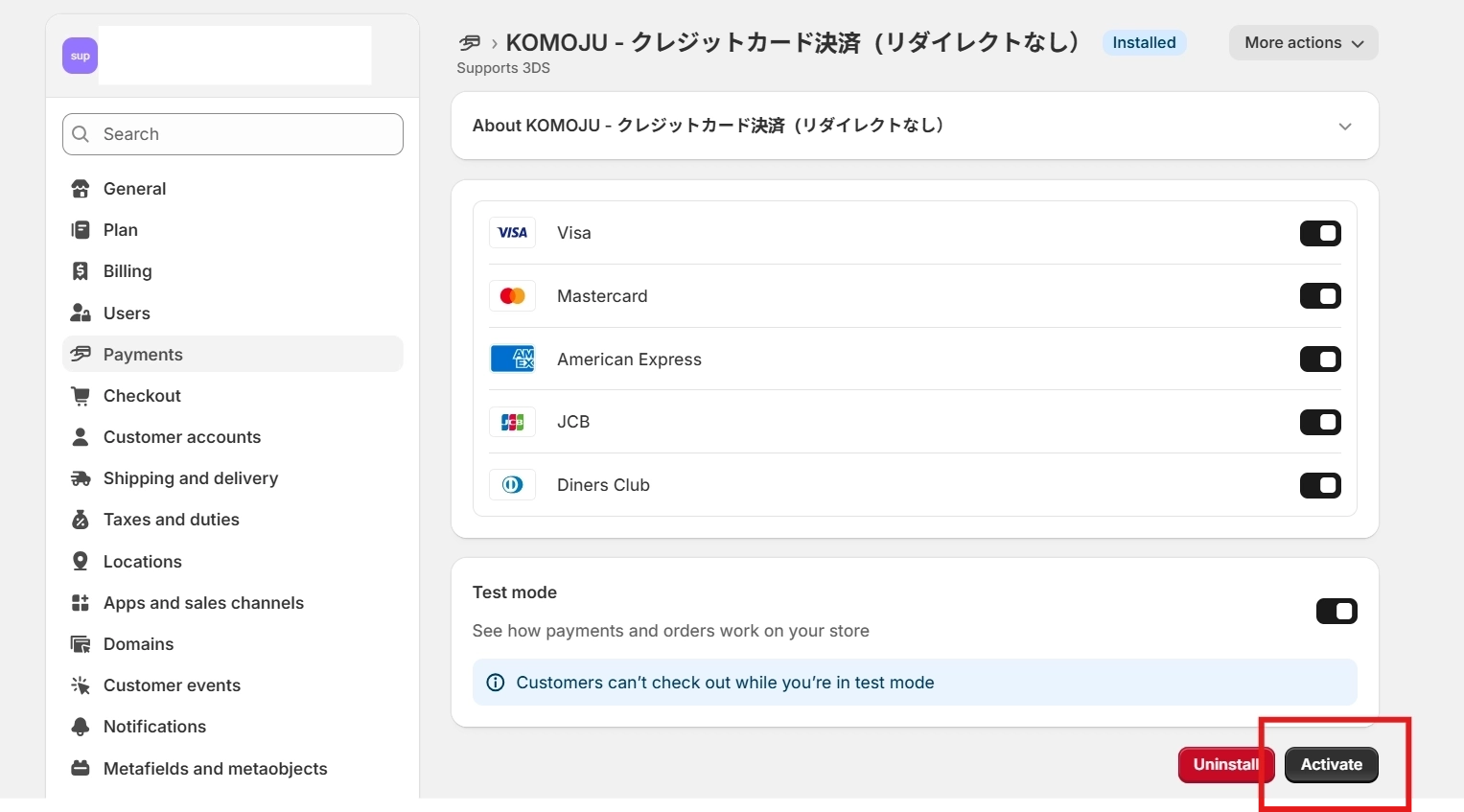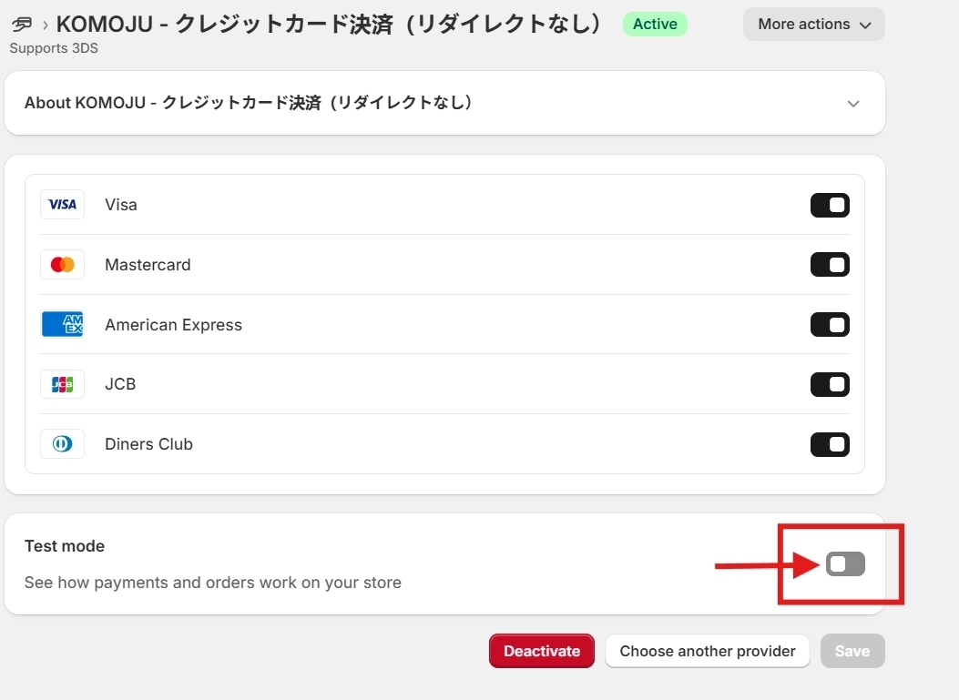 重要:テストモードと本番環境の混在にご注意ください チェックアウト画面上では、テストモードの決済方法と本番環境の決済方法を視覚的に区別することができません。すでに本番稼働している決済方法がある中で、他の決済方法をテストモードのままにしてしまわないよう十分ご注意ください。お客さまがテストモードの決済方法を選択された場合、エラーの理由が表示されず、決済を完了することができなくなります。