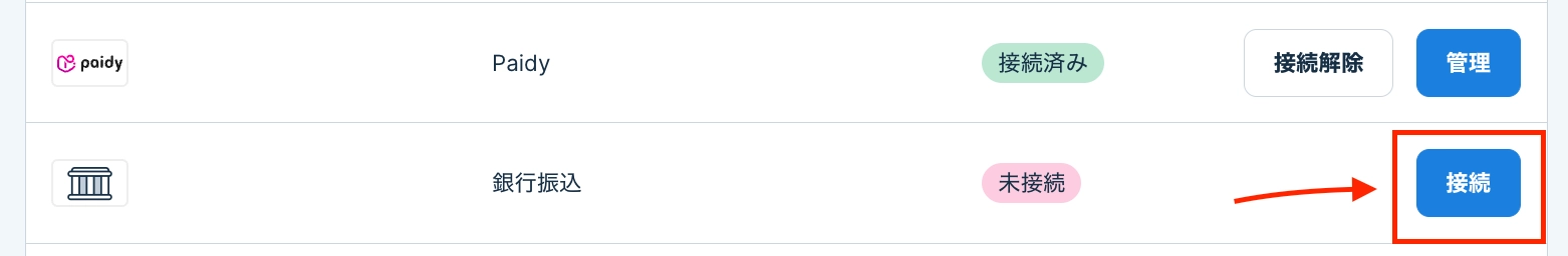 - 決済方法のステータスが「接続済み」になっていることを確認します。