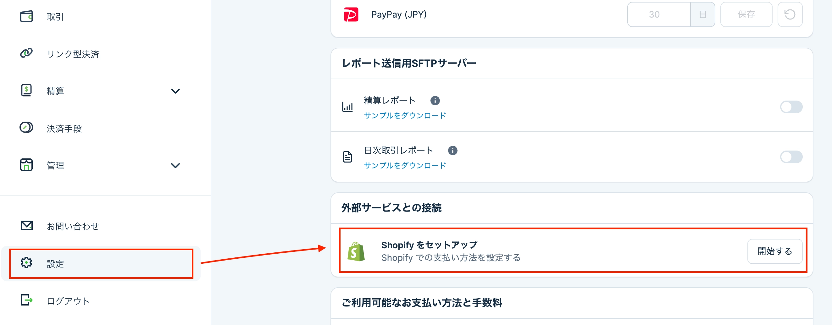 まずはKOMOJUの管理画面にログインし、メニューから 「設定」 ページを開きます。続いて 「Shopifyをセットアップ」 という項目を選択し、「開始する」 というボタンを押してください。すると、Shopifyストアに導入できるKOMOJUの決済方法が一覧で表示されます。