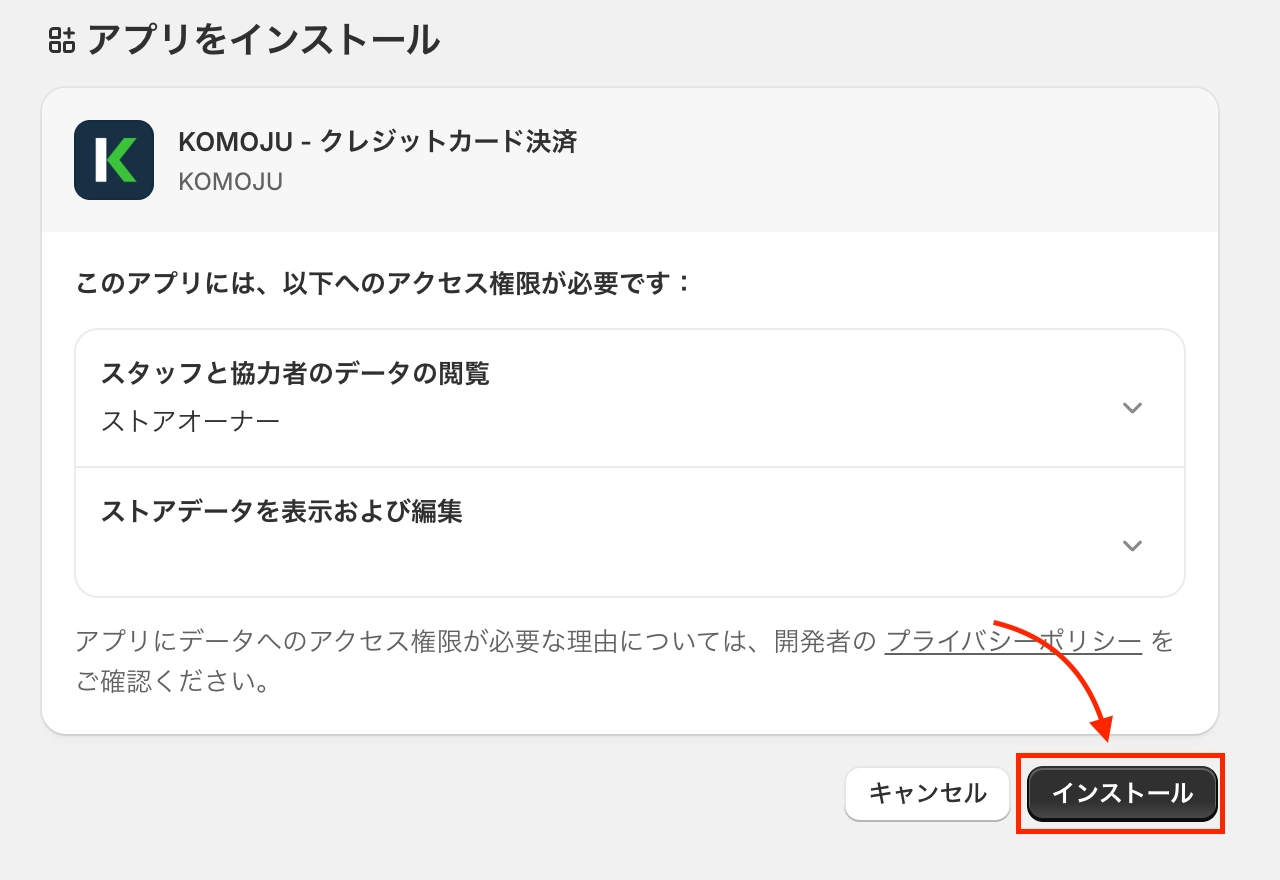 決済アプリのインストール作業を進めるには、Shopifyの「管理者」または「ストアオーナー」権限が必要となります。一般のスタッフアカウントでログインされた場合、権限不足でエラーとなってしまうことがありますので、もし次の画面へうまく進めない場合は、現在のアカウント権限を一度ご確認ください。