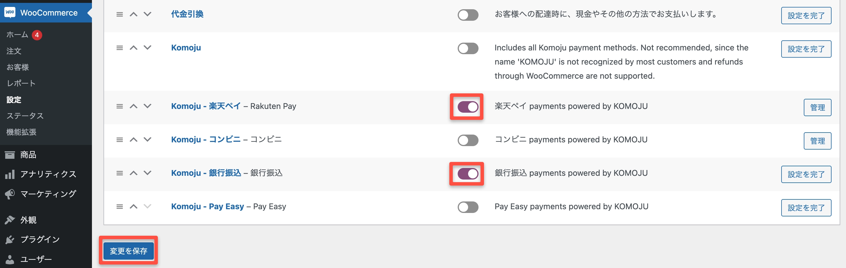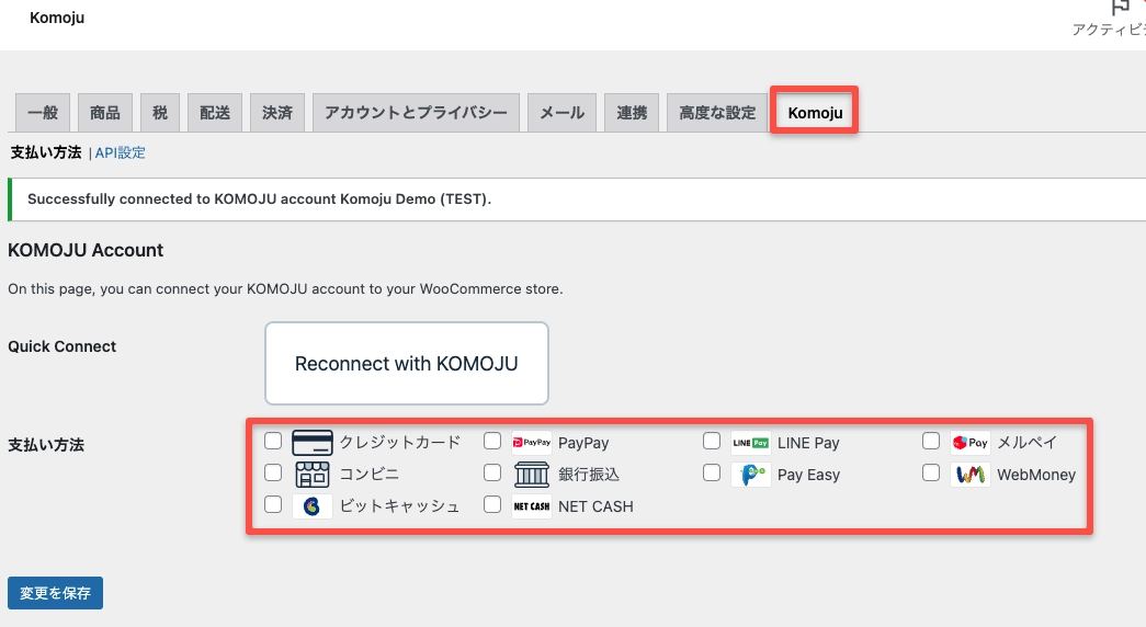 WooCommerce → 設定 → KOMOJU で、提供したい決済方法のチェックボックスをオンにして、「変更を保存」 をクリックします。