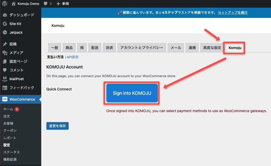 - WooCommerce → 設定 → KOMOJU に移動する