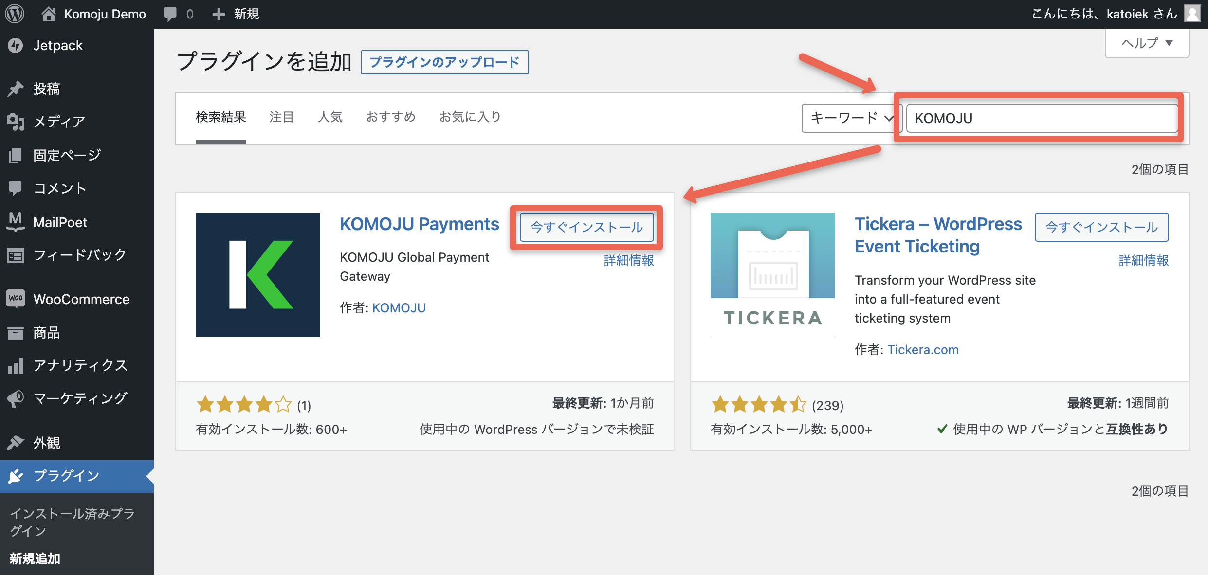 ステップ1: WordPressでKOMOJU Paymentsを検索する