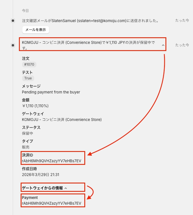 - IDの確認・検索方法: Shopifyのタイムライン、およびKOMOJU管理画面の両方から決済情報やオーダーIDを確認する手順
