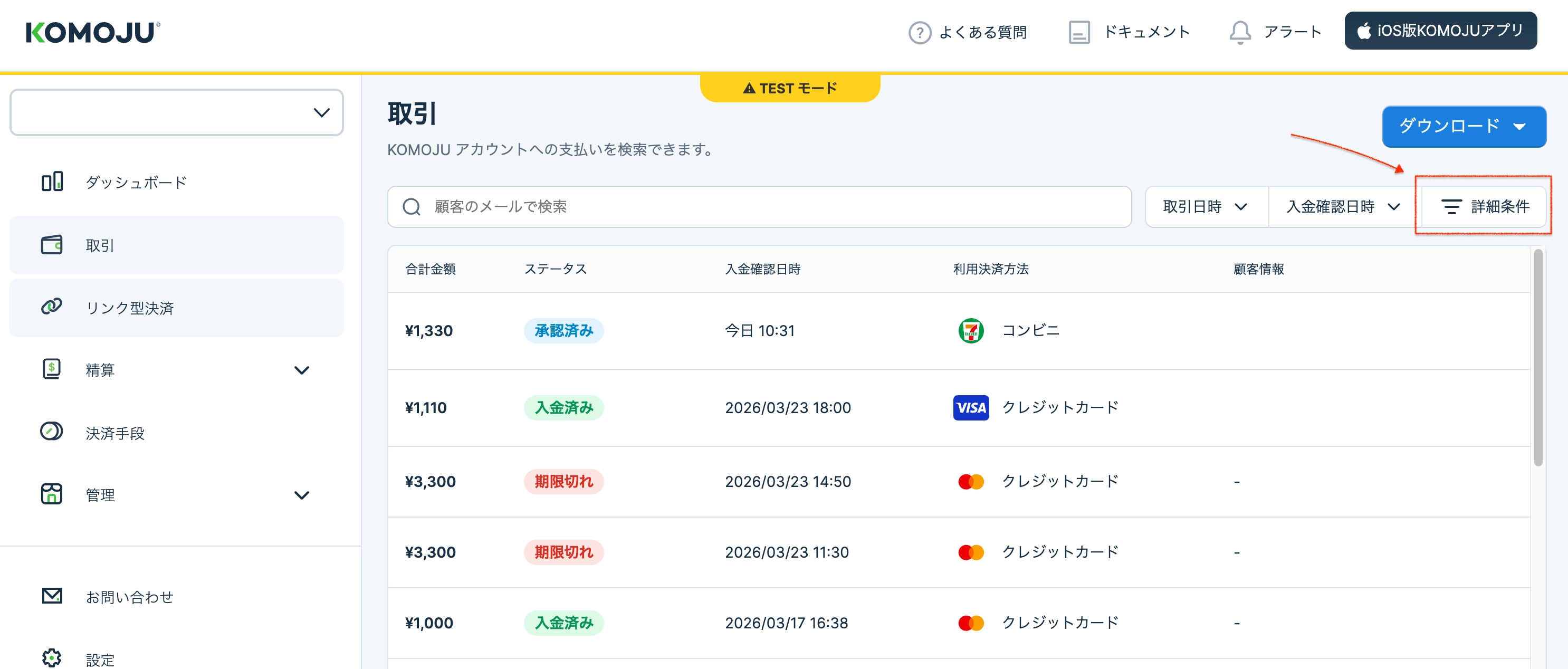 KOMOJU管理画面で検索する
